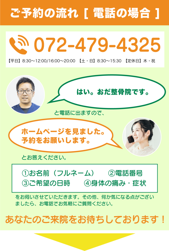 おだ整骨院は、予約優先制のため、お忙しい方でも待たずに施術を受けていただけます。予約は電話(072-479-4325)やネット予約ができます。いつでもお気軽にお問い合わせください。